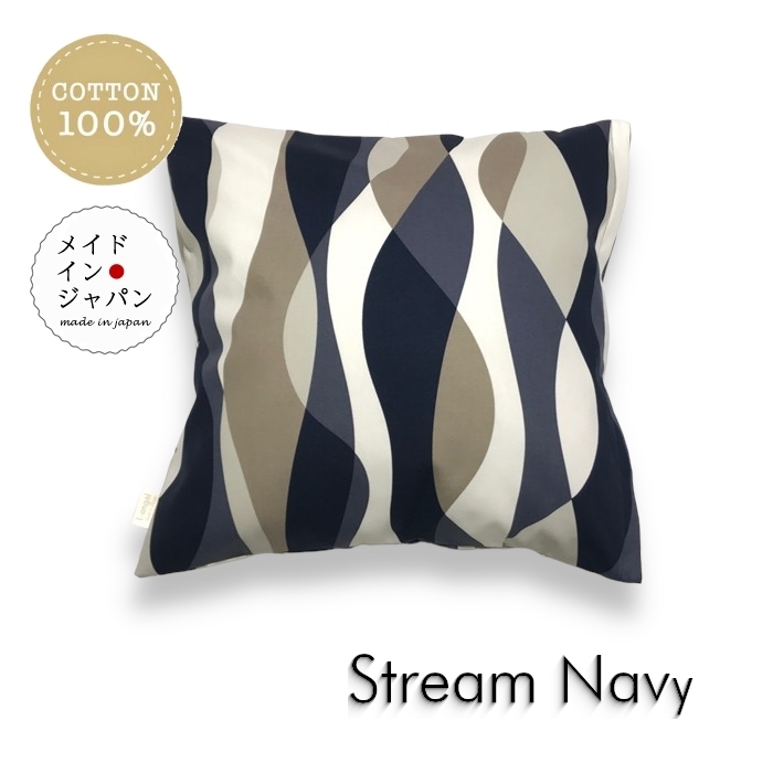 > クッションカバー ストリーム ネイビー 北欧 波柄 45×45cm 綿100%