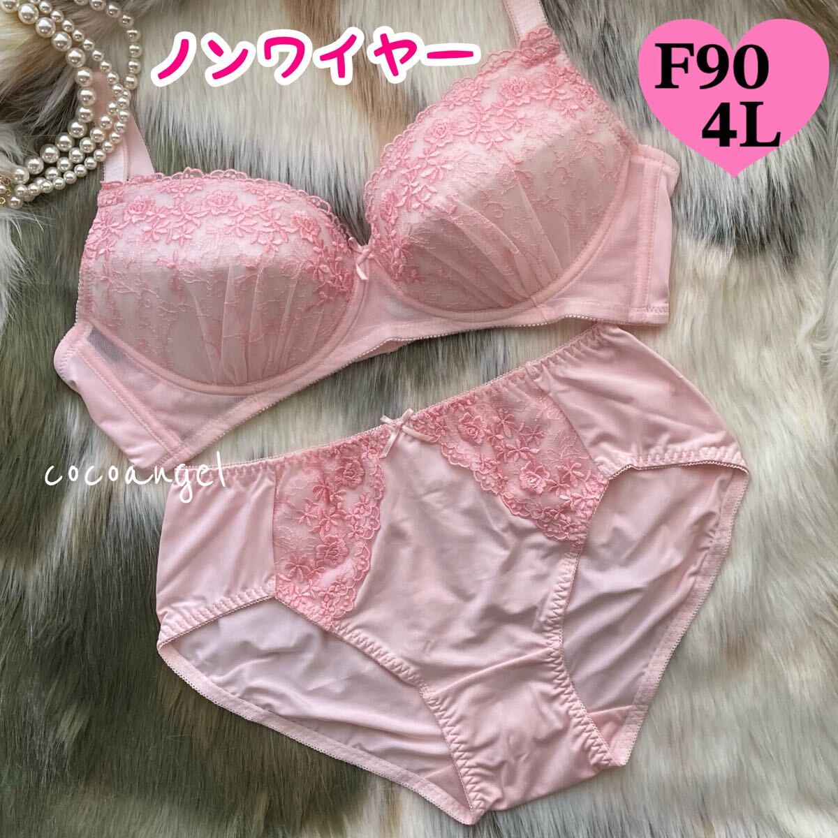 - 【F90/4L ピンク 上下】新品 ノンワイヤー ブラジャーショーツセット リフトアップ 刺繍 清楚 女装 男性用ブラ Fカップ 大きいサイズ