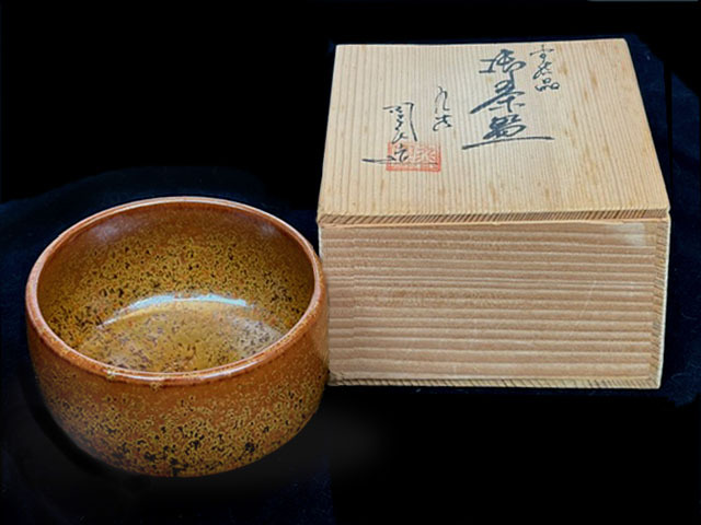 - 茶道具●抹茶碗●九谷焼●銘あり「陶庄造」●錆色●桐箱入り