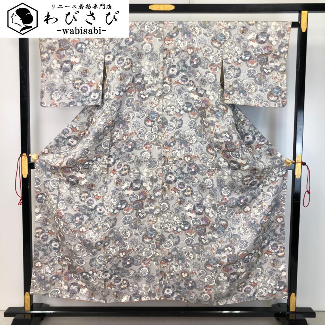 > 小紋 鏡に花模様 白鼠色 K-5047 着物 きもの kimono 和服 和装 中古 リサイクル着物 【送料無料】