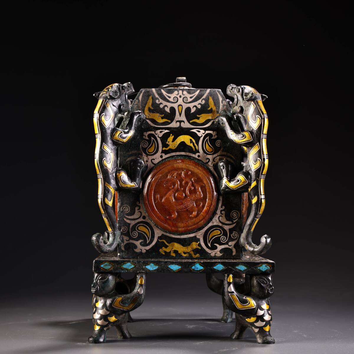 - 唐物 清 青銅器 錯金銀 モザイク寶石 綠松石 方四龍蓋盒 銅製 銅器 極細工 中国古玩 骨董品 古美味 D68