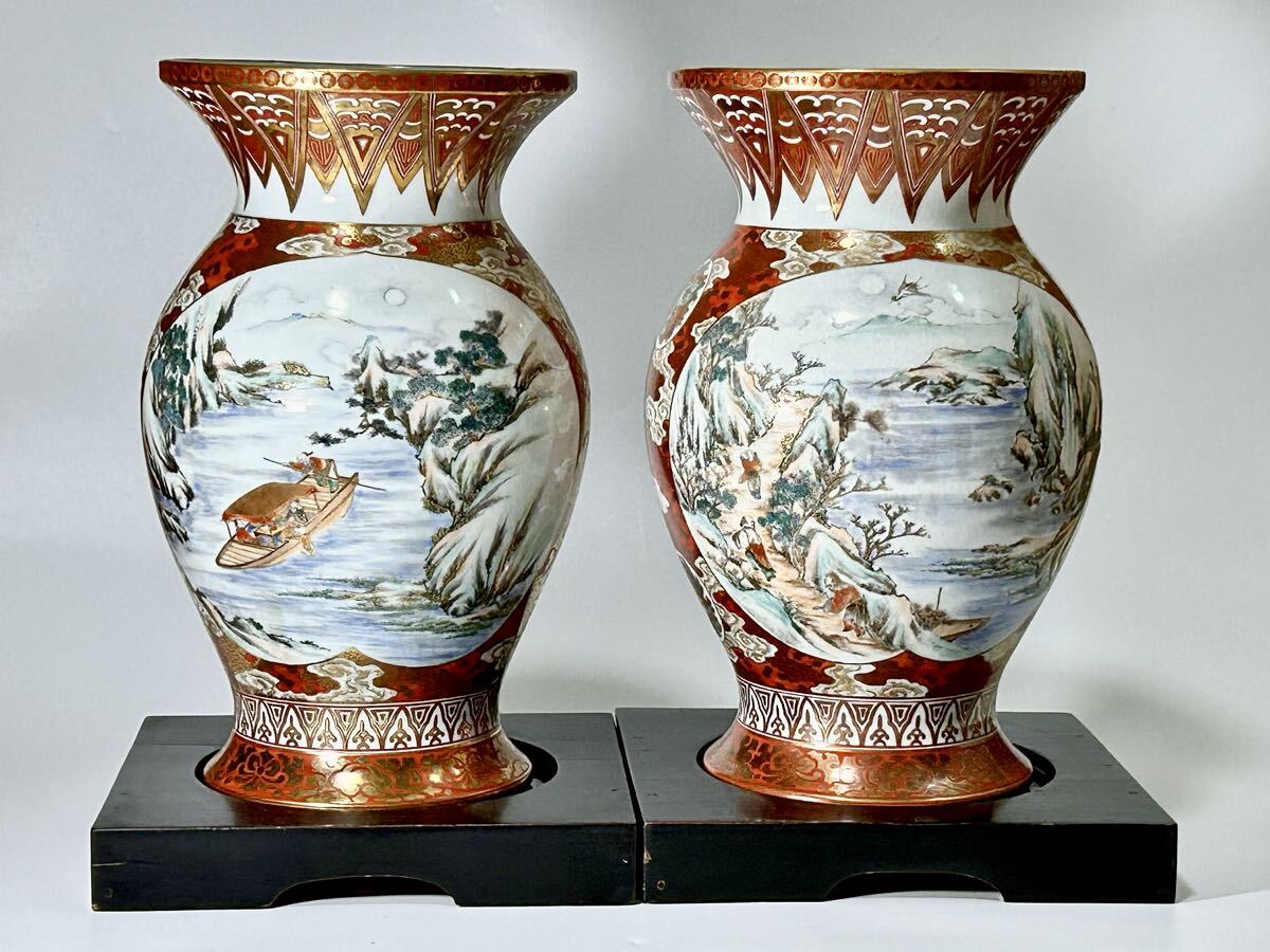 - 明治九谷 松本佐平 松雲堂 赤絵金彩梅鶯文虎渓三笑図花瓶一対 九谷焼 九谷