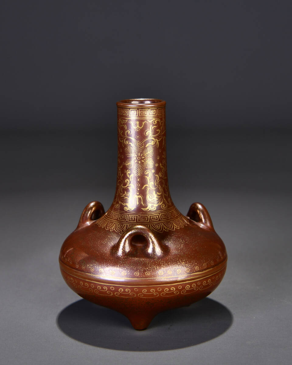 > 多宝閣 ■ 207070 人間国宝 中国磁器【清朝乾隆時代錆赤釉金花瓶】工芸品 施釉陶 陶芸 置物 收藏品 孤品