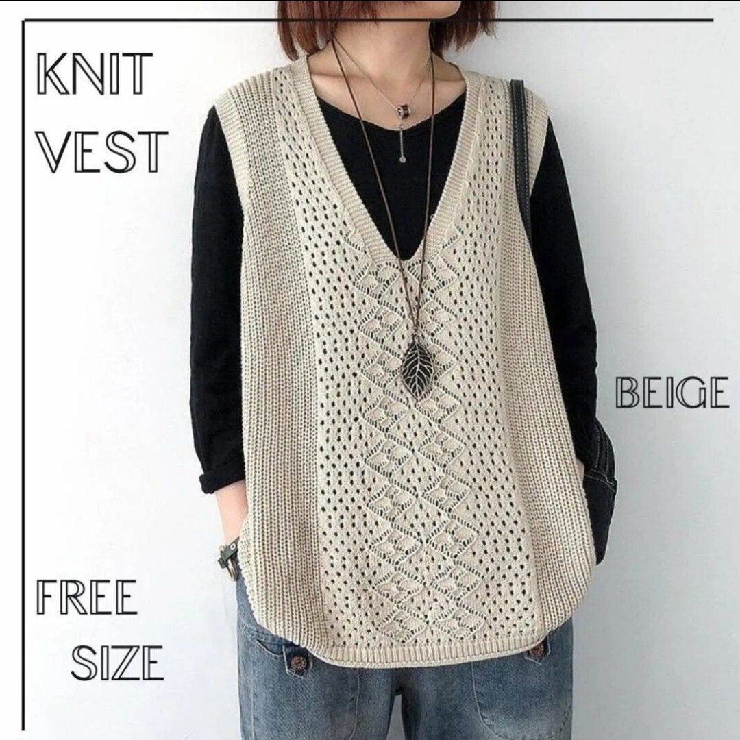 - ニットベスト レディース 体型カバー 着痩せ ジレ 透かし編み Vネック サマーニット 春夏秋 ベージュ シンプル