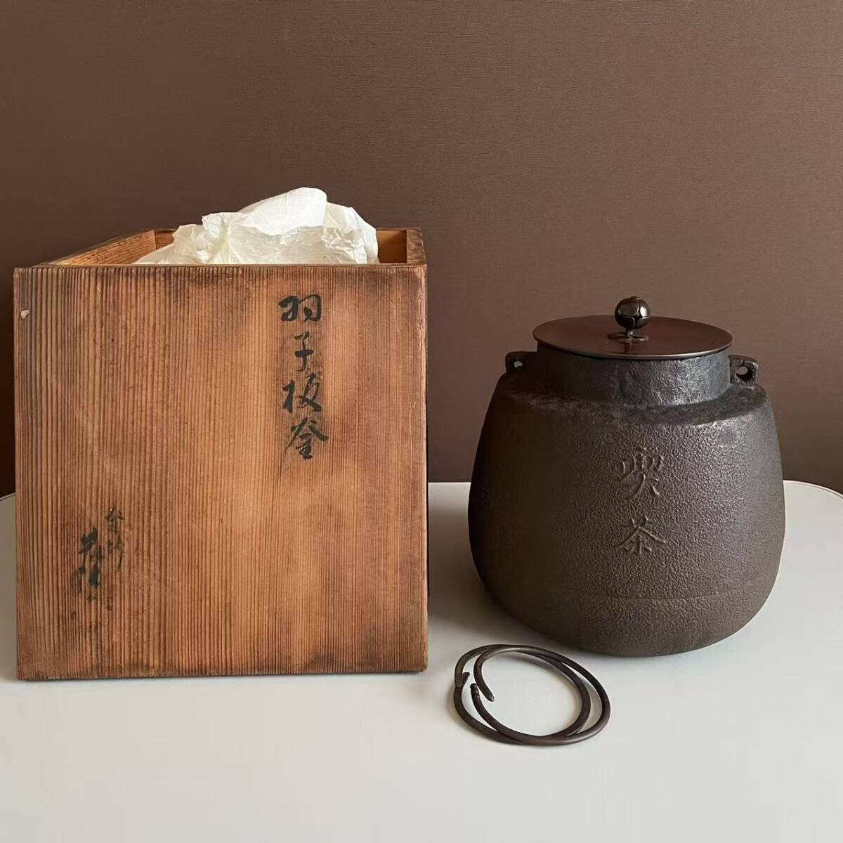 - 風炉釜 羽子板釜 且坐 喫茶字入 茶道具 喫茶釜 釜鐶付 木製箱付き 骨董 茶器 茶道具 共箱 アンティーク コレクション 金属工芸 K04