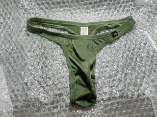 > TMコレクション、メンズビキニ、綺麗なモスグリーン、縦横佳く伸びる生地、フロント部ノーシーム、Tバック、ナイロン72%、Mサイズ、
