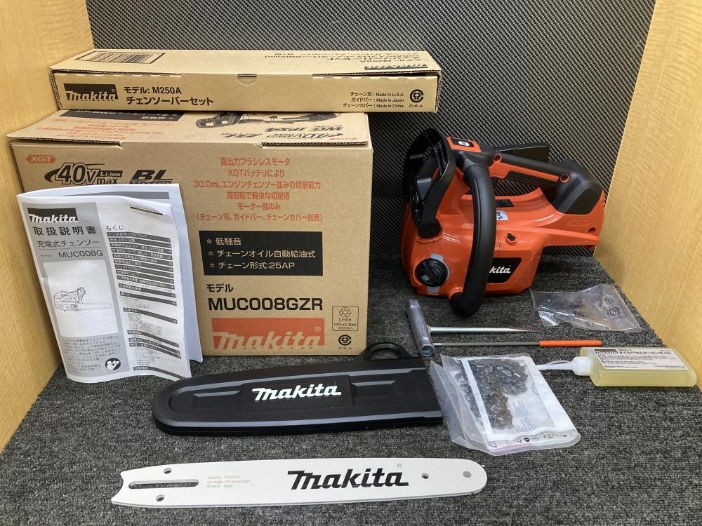 - 013♪未使用品♪makita マキタ 充電式チェンソー 本体+スプロケットノーズバーセット MUC008GZR2 M250A 40Vmax 25AP仕様 250mm