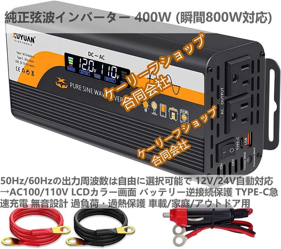 - 【新発売】純正弦波インバーター 400W(瞬間800W) 12V/24V自動切替→AC100V 50Hz/60Hz選択式 USB-C充電 静音設計 車載/家庭用/アウトドア用