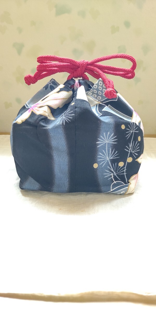 - 浴衣地巾着(黒とグレーの縞に桜と金魚他)・B品