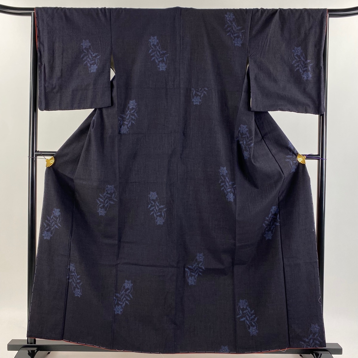 - 結城紬 身丈160cm 裄丈66.5cm M 袷 本場結城紬 奥順 証紙 草花 濃紺 正絹 美品 逸品 【中古】