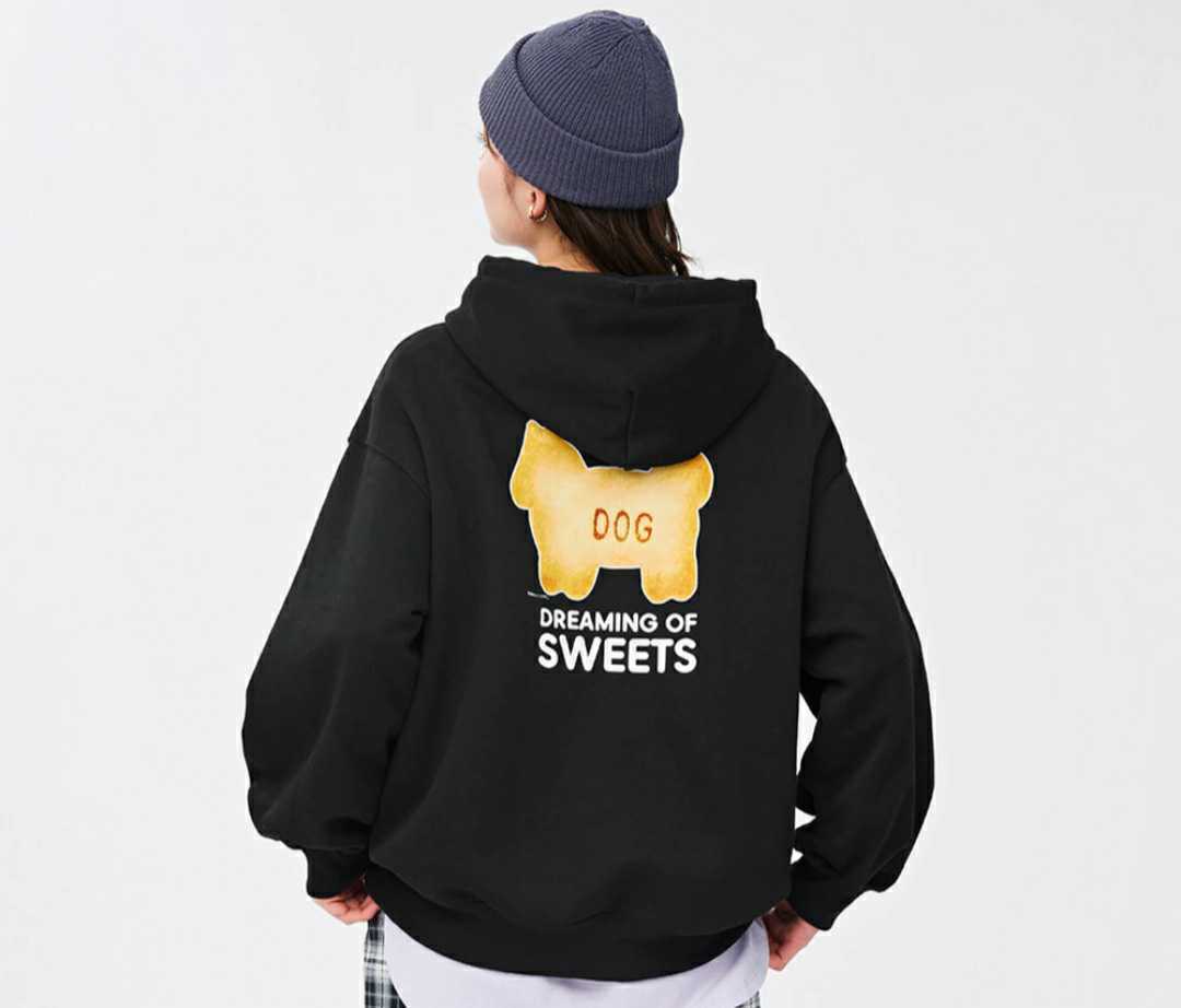 - XLサイズ たべっ子どうぶつ ギンビス GU 新品 スウェットプルパーカー ブラック 黒 ビスケット柄 長袖 スウェット パーカ フーディー