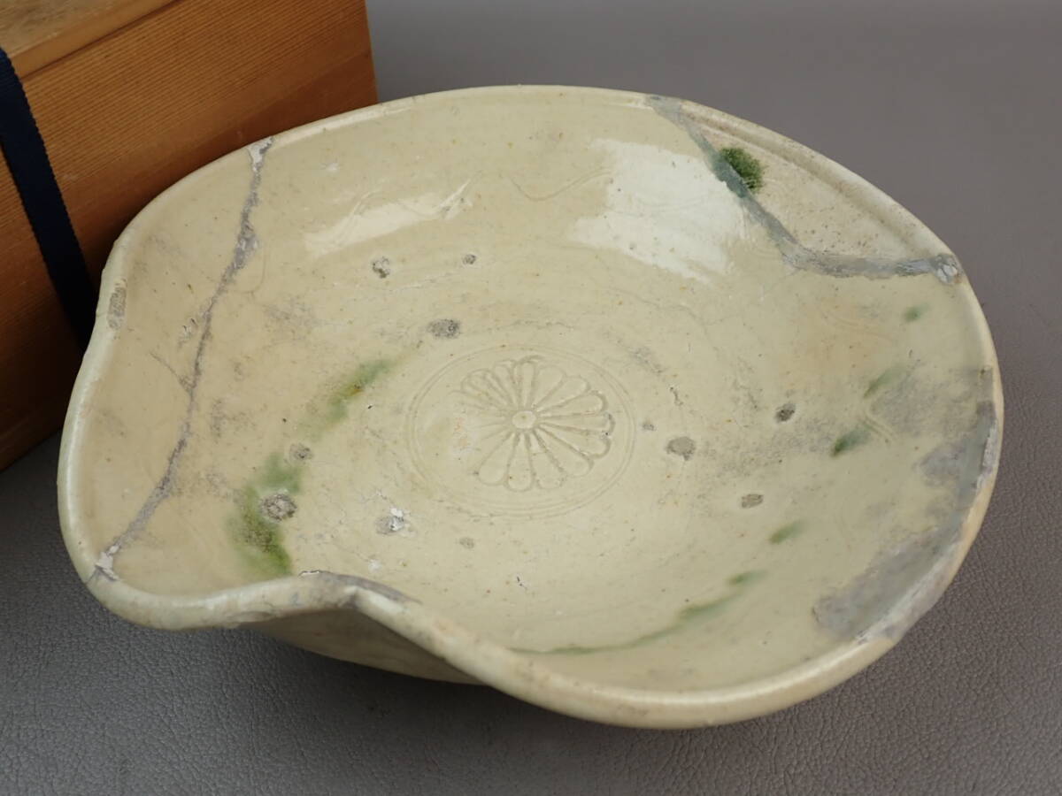 - 【骨董・茶道具】★古い 瀬戸焼 古瀬戸★★古瀬戸印花文大皿 片口 gn105wb 古美濃 織部 黄瀬戸 盛鉢 茶碗 和食器