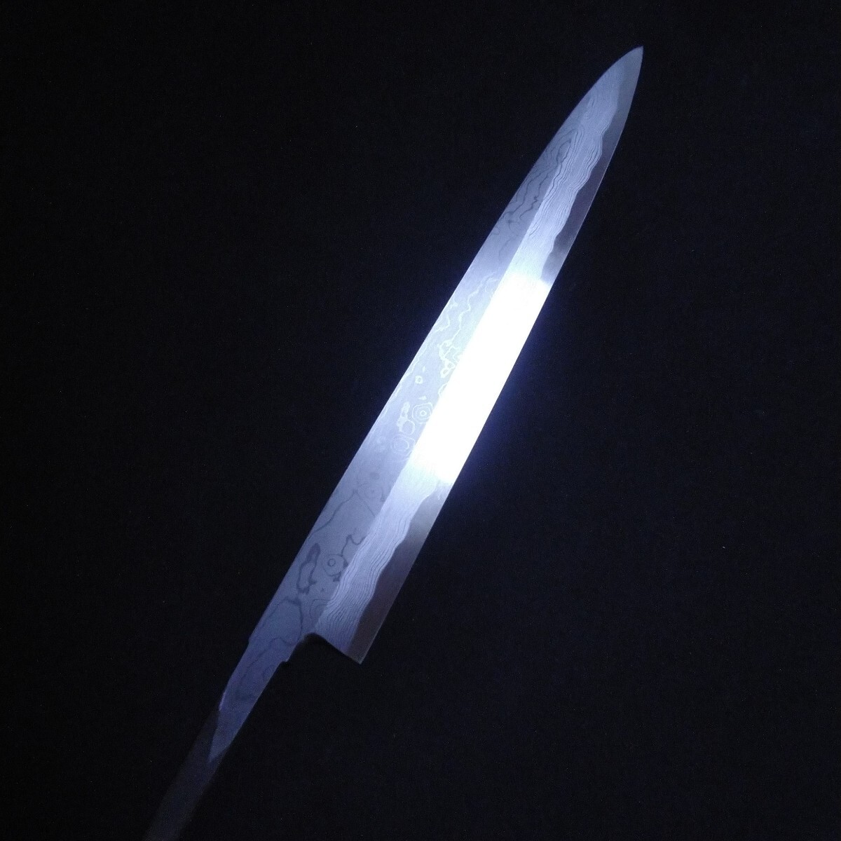- 城山刃物製作所(堺業務用刃物メーカー直売)八寸 柳刃包丁 青二鋼ダマスカス 鏡面ぼかし仕上げ 黒檀八角水牛柄