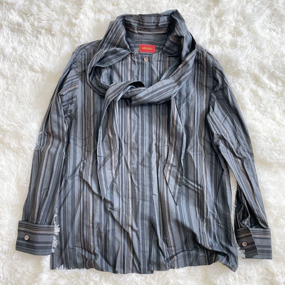 - 希少デザイン KENZO ケンゾー ボウタイ付き ストライプシャツ ブラウス 2サイズ 長袖 コットン100% グレー フォーマル オフィス ビジネス
