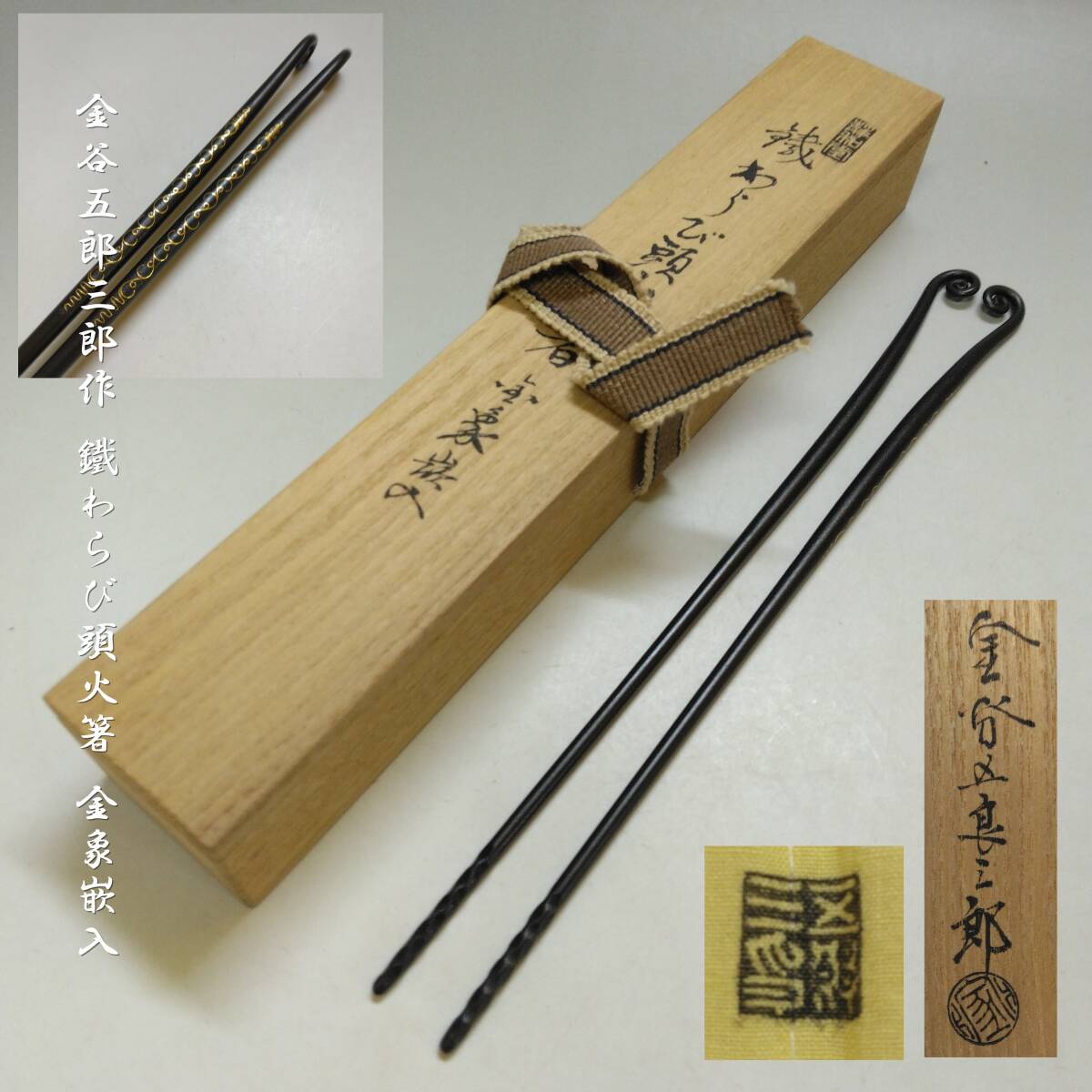 - 【S-175】十三世 金谷五郎三郎 作 鐵わらび頭火箸 金象嵌入 共箱入 茶道具