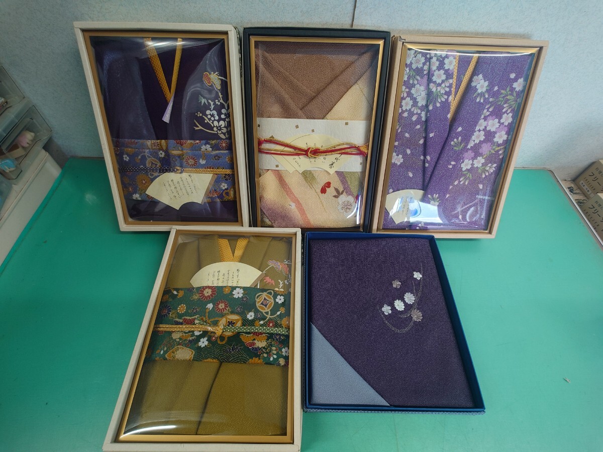 - ● 高級 彩美 風呂敷 袱紗 金銀彩 刺繍入り 金封 しけ引桜 縮緬 ちりめん 友仙 千代寿 さめ小紋 鮫小紋 箱入り 未使用品 5箱 まとめて ①