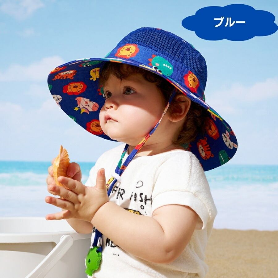 > ブルー Mサイズ 子供用 ベビー 帽子 ハット 日焼け防止 紫外線 首ひも 海水浴 プール 笛付 あご紐 UPF50 紫外線防止 メッシュ