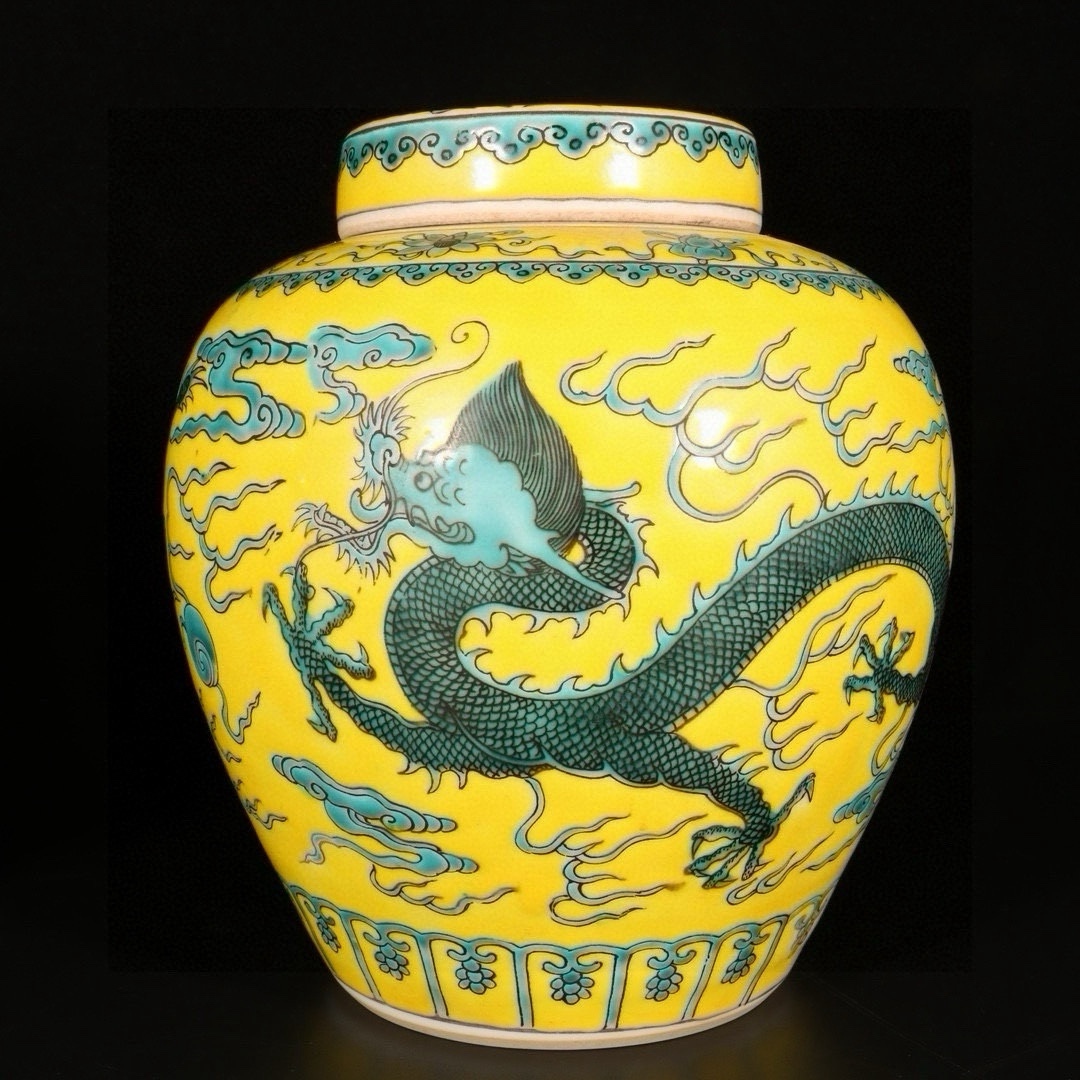 > 清時代 乾隆年製 黄地緑彩 龍紋缶 陶磁器 中国美術 唐物 古美術 置物 高さ17 cm 直径14 cm 820
