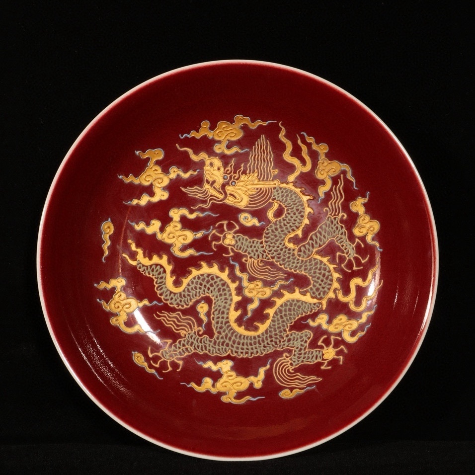 - 秘藏 明時代 宣徳年製 祭祀赤釉 瀝粉蒔き金 雲龍紋皿 時代物 汝窯 唐物 陶磁器 中国美術 高さ5 cm 直径22.5 cm 古物保証 820