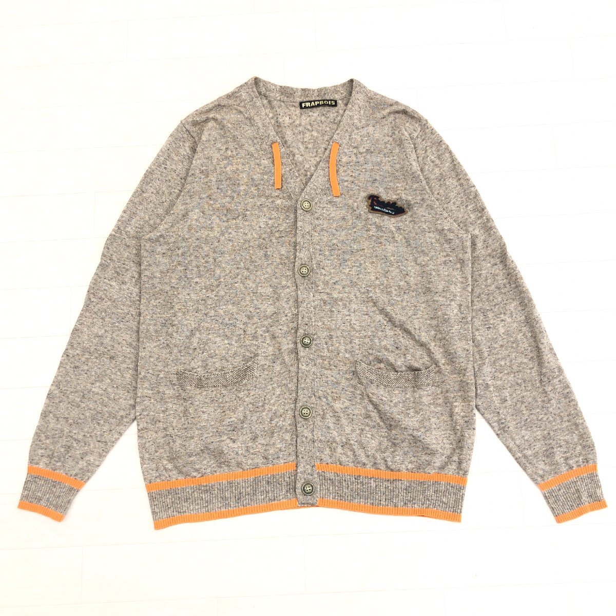 > 美品 FRAPBOIS フラボア ロゴワッペン 麻 リネン混 ニット カーディガン 1 ブラウン系 セーター 羽織り ジャケット メンズ 紳士 個性派
