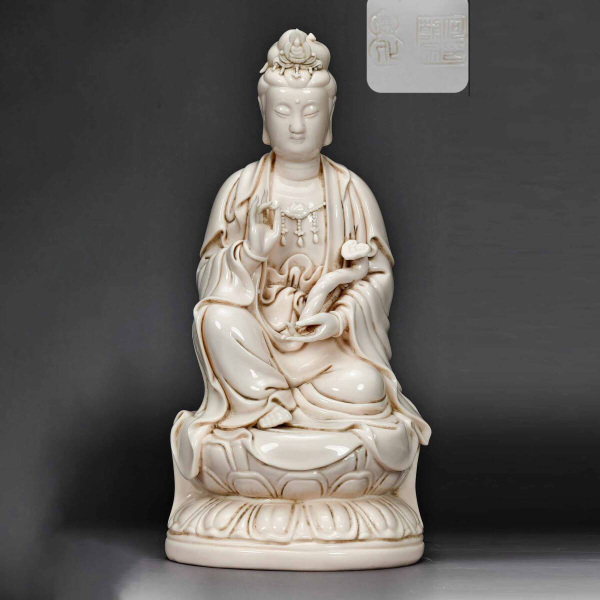 > 8+GV7095「東洋美術」 中国骨董 人間国宝 磁器製品【徳化窯の磁器彫刻像、如意観音、】 旧物 孤品 珍品 陶磁器 収蔵価値が高い