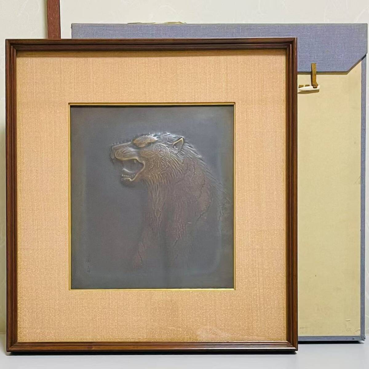 - 彫金家 亀倉蒲舟 虎 銅板 彫金額 黄袋 タトウ箱 日本工芸 刻印 鍛金(検索:金工額 額装 壁掛 置物 額 彫金 絵画 明治金工 金工作品)