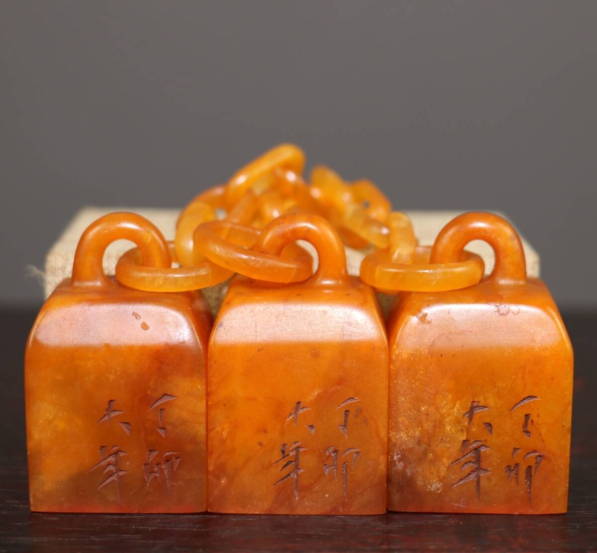 - 時代旧蔵 珍品田黄石 印鑑精彫 三連章閑章置物 印章 時代古玉細密細工★古置物★古賞物★古擺件★蒐集家放出★唐物821
