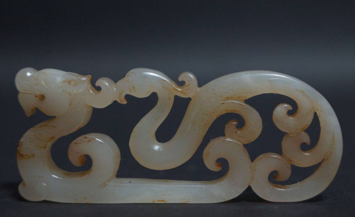 - 【閑】古玉 和田玉(ホータン)細工透かし彫り 古代龍鳳紋 根付 緒締玉 玉佩 提げ物 装飾品 幅8.3㎝☆美しい石目☆時代物☆7D0821