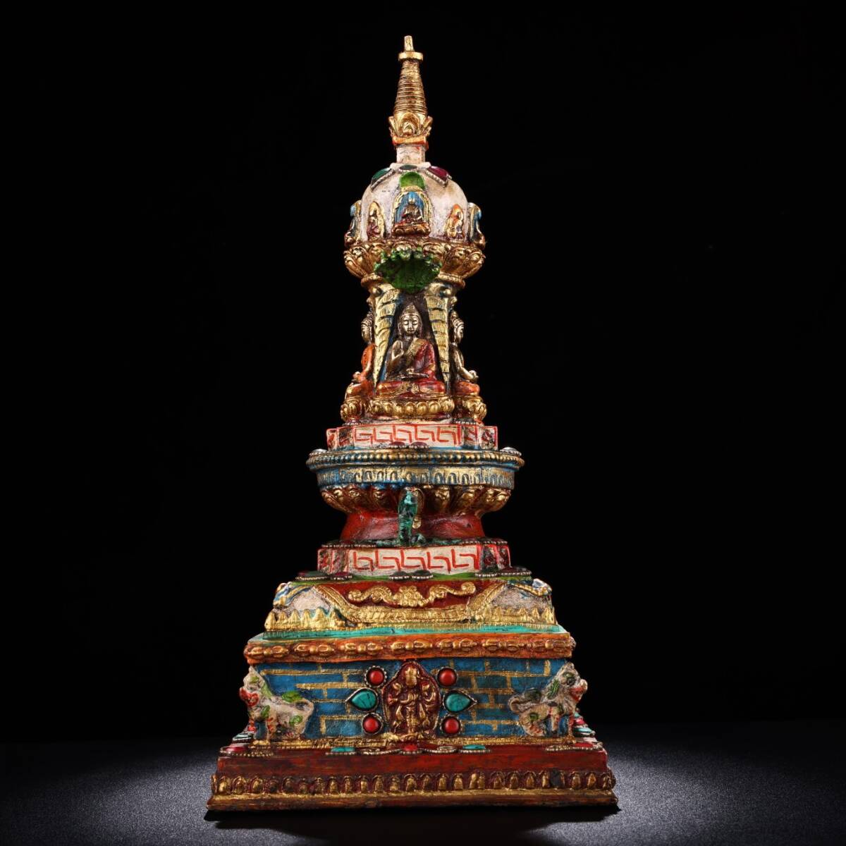> 多宝閣■ 207299 人間国宝 中国古美術 銅製品 【宝石をちりばめ、色鮮やかに彩色され、金箔を貼ったチベットの四面仏塔のコレクション】