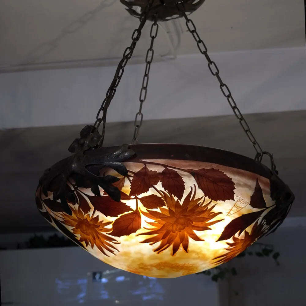 - 【心に染みわたる”情景” Daum 3灯シャンデリア】 ダリア花カメオガラス ドーム ナンシー インテリア フランスアンティークヌーボー