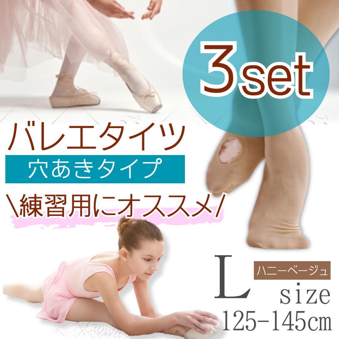 - バレエタイツ 穴あきタイプ ダンス キッズ バレエ 新体操 ハニーベージュ Lサイズ 125〜145cm 3枚 練習用