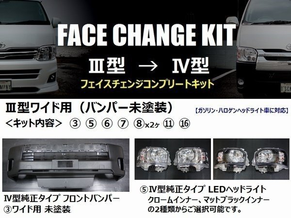 - ▼ ハイエース 200系 ワイドボディ [3型 → 4型] フェイスチェンジ キット ディスチャージ バンパー未塗装 S-GL ワゴンGL グランドキャビン