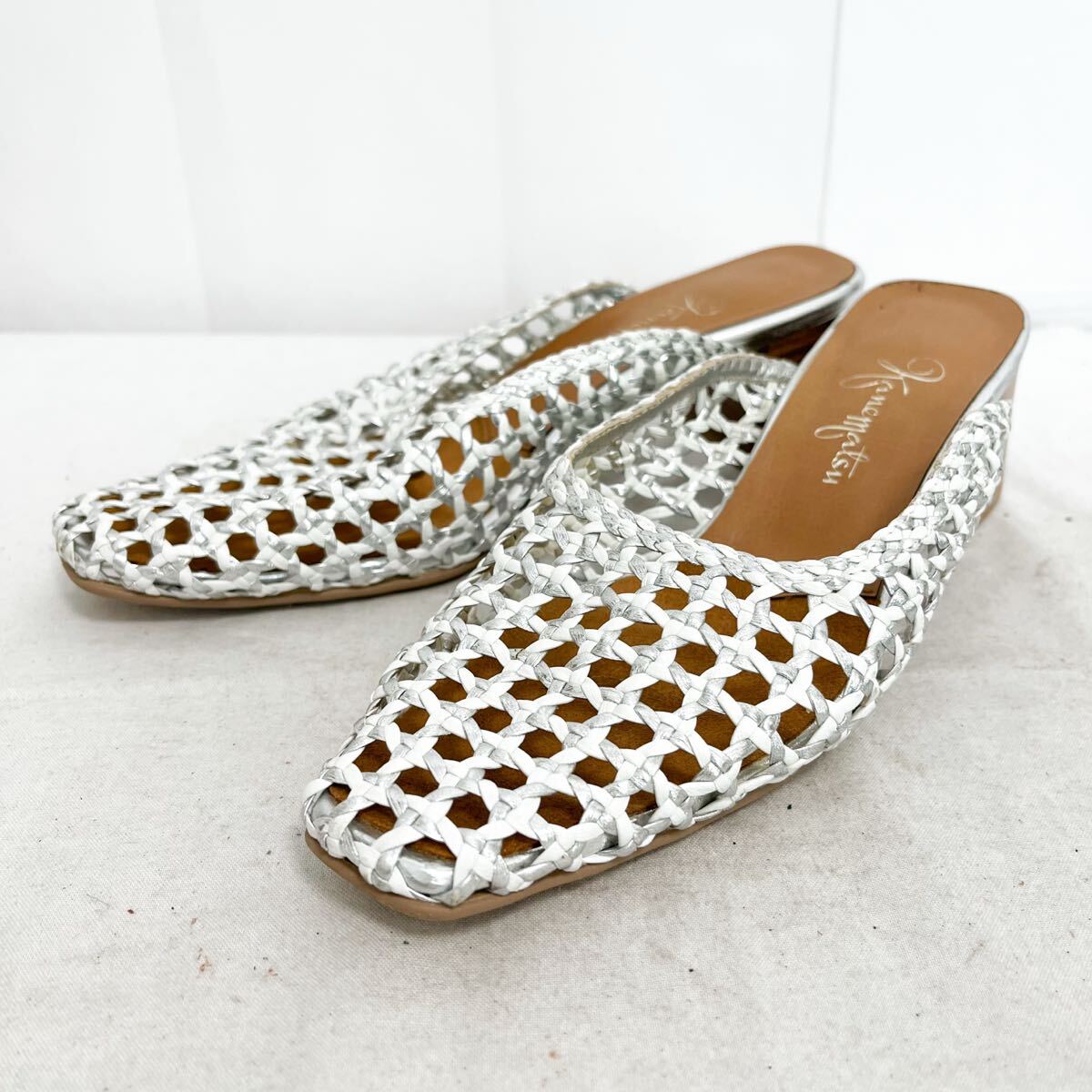> 和825★ GINZA Kanematsu 銀座かねまつ レザー パンプス サンダル ミュール ヒール 編み込み 23 D ホワイト シルバー レディース