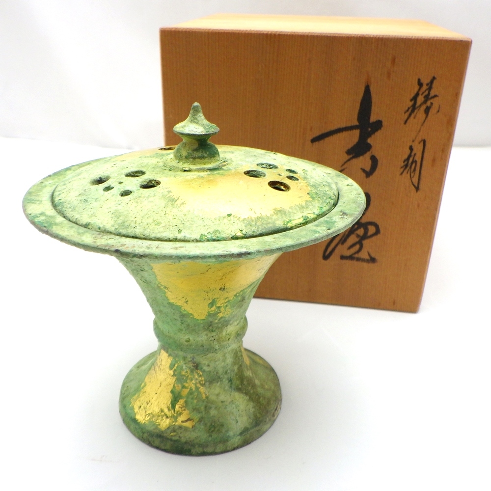 - SI-105【未使用】高岡銅器 正晴 正晴堂 香炉 末広 蓋つき 金彩 木箱・栞 アンティークショップ保管品 デッドストック 昭和レトロ