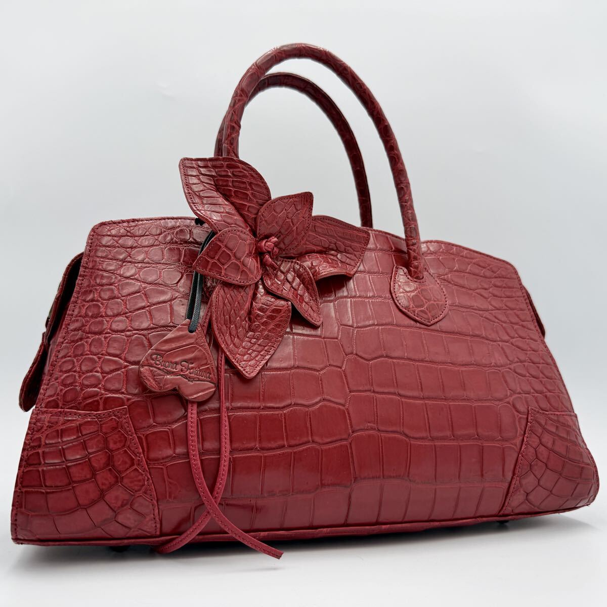 > 【フラワーモチーフ】マットクロコダイル ハンドバッグ 本革 リアルレザー ワニ革 エキゾチック センター取り 赤 レッド 花 鞄