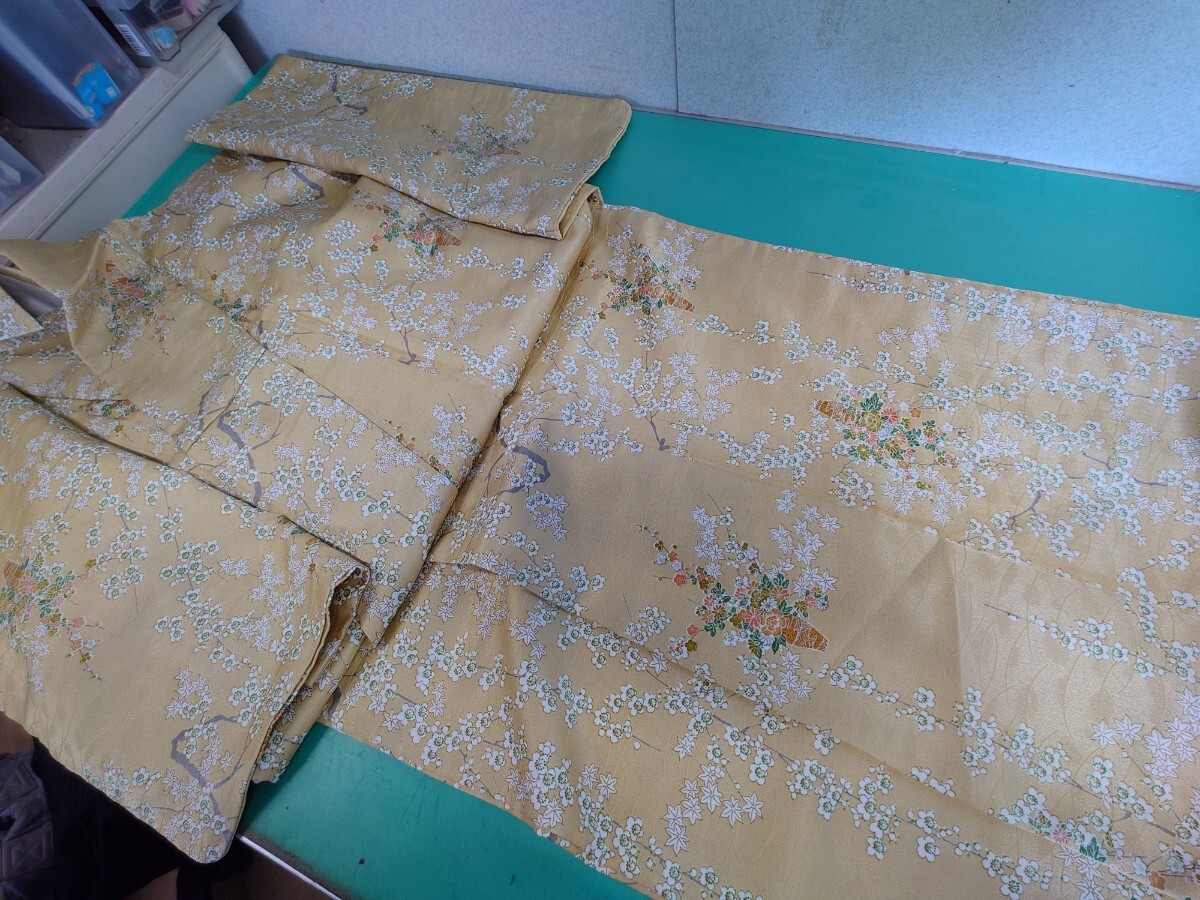 - ●140 華やか ステキな くすみ 黄色系 梅 紅葉 生け花 花々 模様 可愛い 素敵 柄 着物 しつけ糸付 未使用品 ①