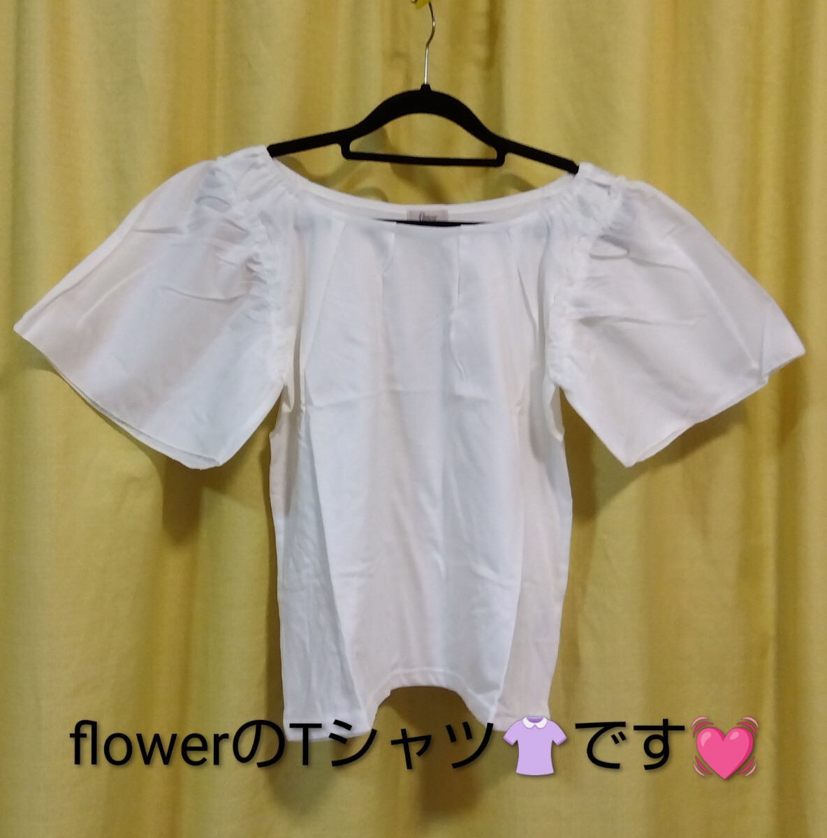 > 【未使用品】flowerのTシャツ、袖異素材カットソー、 ホワイト・白、半袖、首元タックあり、前後肩周りフリルあり、シンプル可愛い