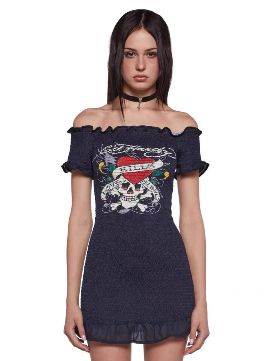 > 新品SIZE:L. SKULL SMOCKED MINI DRESS未使用ED HARDY 半袖 半袖Tシャツ ワンピース黒 ドレス ブラック