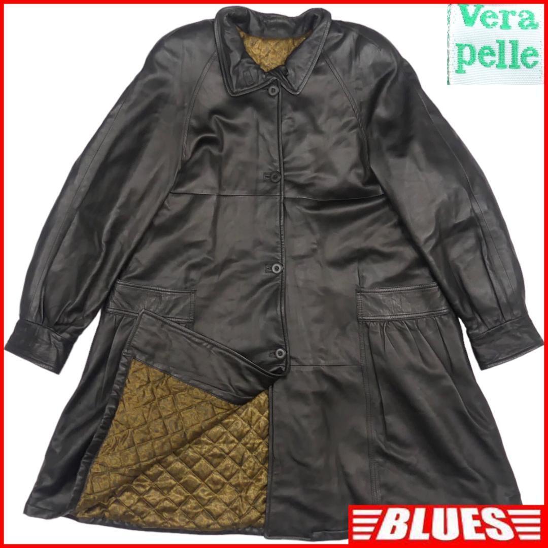 > 即決★イタリア製 Vera pelle★メンズXL レザーステンカラーコート ベラペレ 42 黒 キルティング 本革 ジャケット 皮 ロングコート