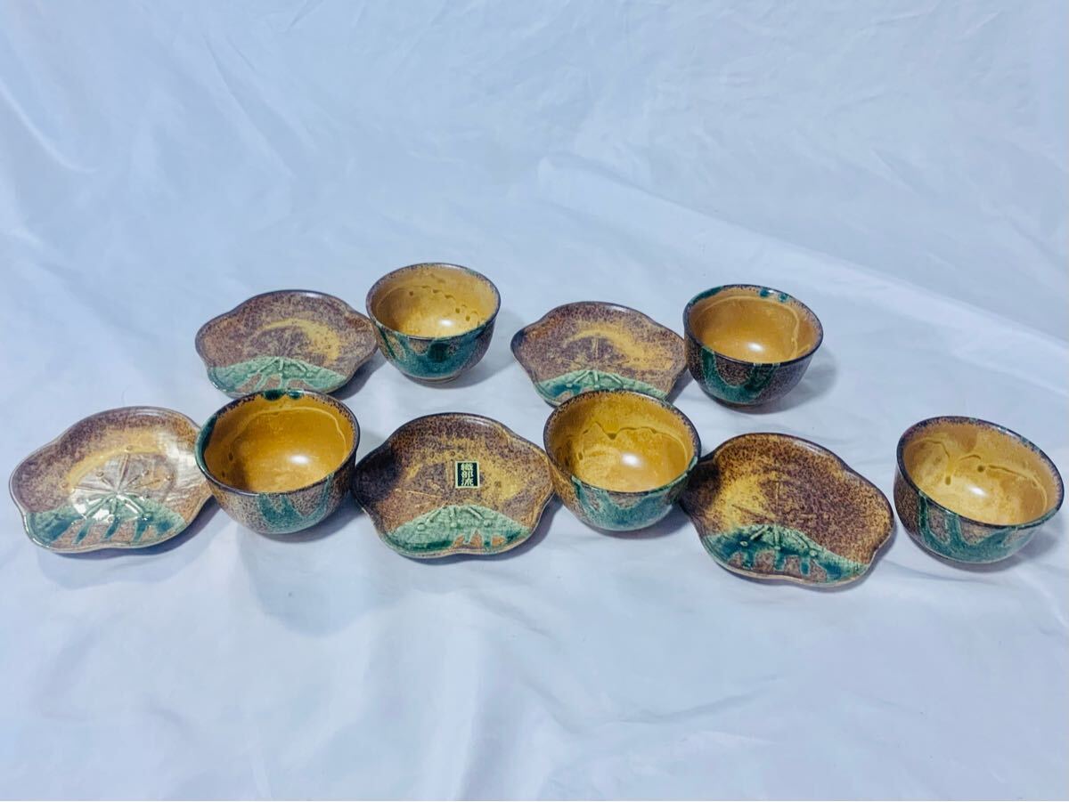 > 未使用 織部流 茶菓揃 湯呑み 湯呑 湯のみ 銘々皿 5客 セット 陶器 陶磁器 骨董 茶器