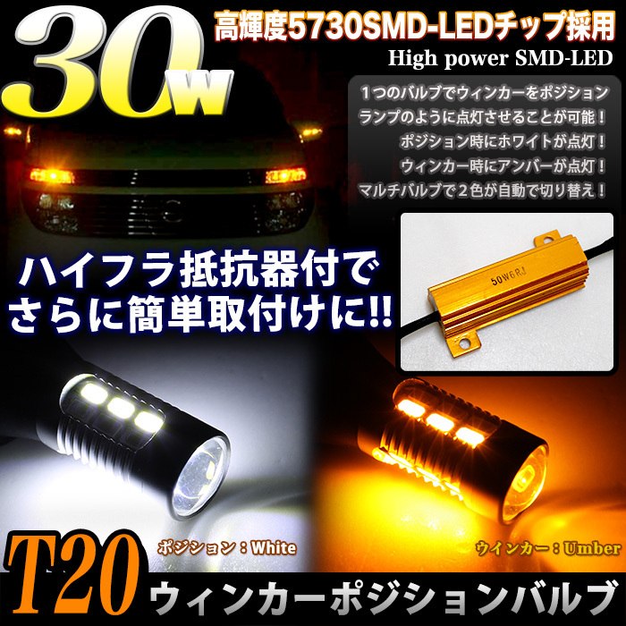 - 30W T20 ウインカー ポジションキット ハイフラ 防止 抵抗器付 白黄 FJ4703