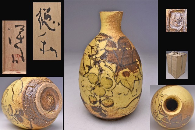 > 三宅洋司 ★ 徳利 ★ 共箱 ★ 上作 ★ 酒器 ★ 黄伊羅保風 ★ 伊藤公象氏に師事 ★ 益子焼 ★ 大胆に描かれた葡萄文が魅力的な逸品 ★