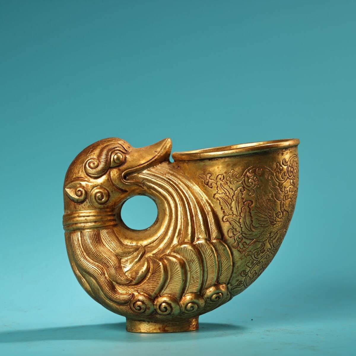 - ▽鴻▽ 銅製 塗金 鳳凰酒杯 箱付 置物 賞物 古賞物 古董品 時代物 稀少珍品 中国古玩 中国古美術