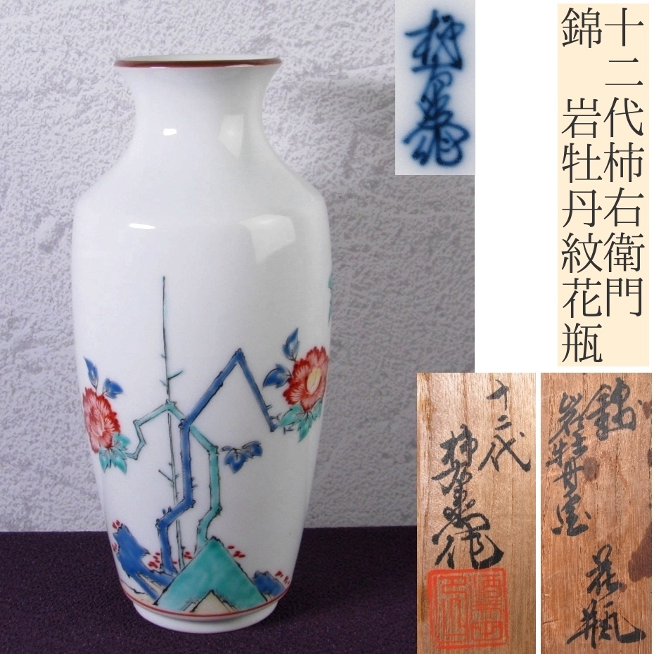 > 十二代柿右衛門 錦 岩牡丹紋花瓶 高さ:18.2cm 共箱 美品/25h028