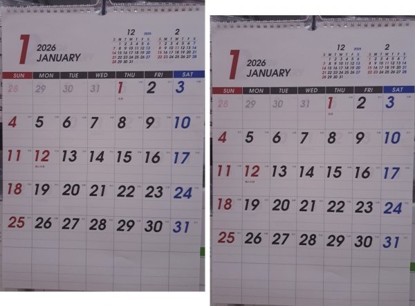 - 【送料無料:2冊:3色 大文字 カレンダー:A3:42x30cm:2026年】★見やすい (全週:1行) :壁掛け:(Wリング)★令和8年:暦 こよみ:No1D