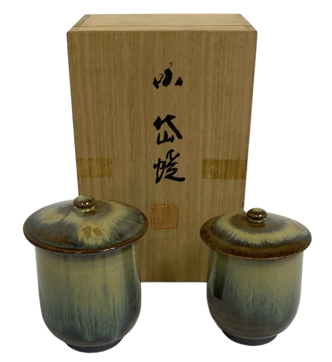 - 【新品未使用品】 夫婦湯呑 熊本伝統工芸品 小代焼 蓋付 夫婦 湯呑み ペア 湯呑 陶磁器 共箱付き 23そ311