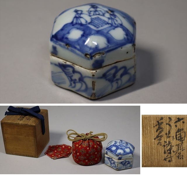 - ★中国明時代(17世紀) 古染付六角人物文香合 唐物 染付傑作品 次第最高 茶道具