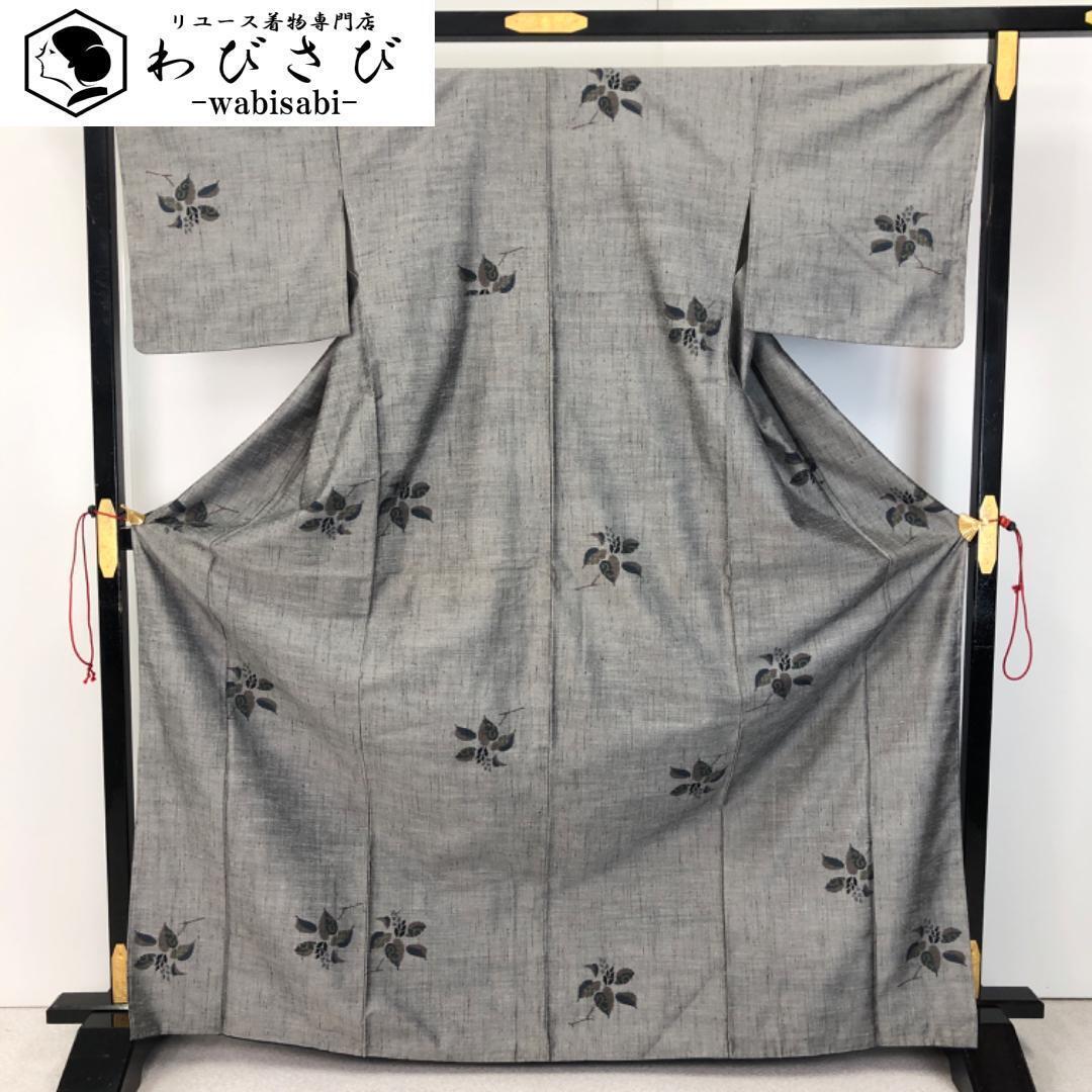 > 紬着物 花模様 灰色 しつけ糸 トールサイズ K-5164 着物 きもの kimono 和服 和装 中古 リサイクル着物 【送料無料】