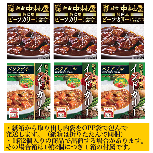- ■新宿中村屋 純欧風ビーフカリー(黒箱)・インドカリー(ベジタブル) 2種6箱■