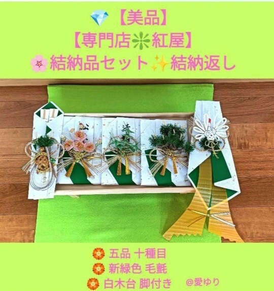 - 【美品★専門店★紅屋】本式★結納品セット★結納返し用★五品十種目★新緑色 毛氈★白木台脚付き★水引き飾り★結婚★顔合わせ★寿栄廣